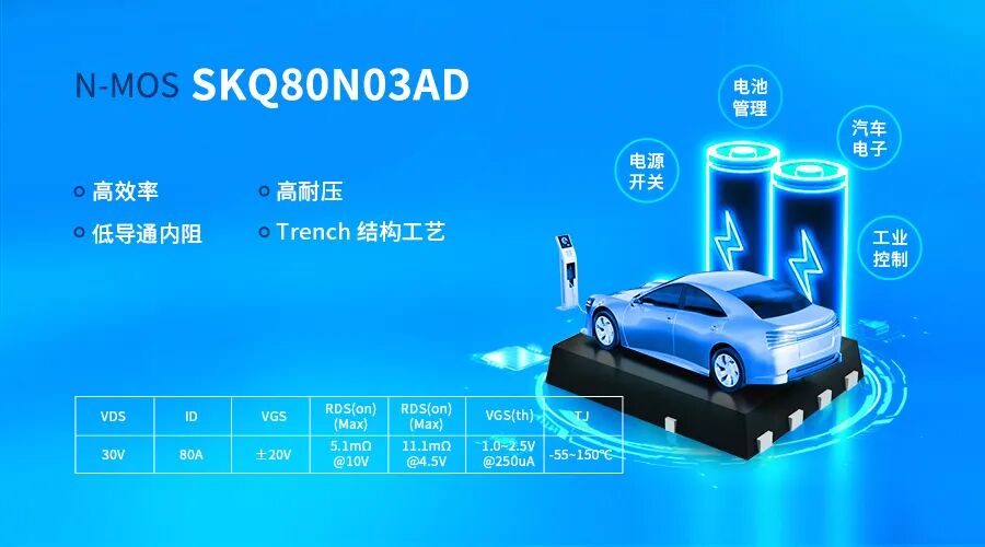 SKQ80N03AD 因其宽广的工作温度范围(-55~150℃)和高可靠性,非常适合汽车电子应用。高可靠性使其能够在汽车的恶劣环境下稳定工作,满足汽车电子设备的严格要求。典型应用:如 电动车电机控制、车载电源管理系统,确保汽车电动化和智能化系统的长期稳定运行。